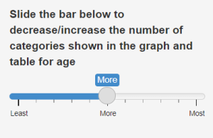 Some of the characteristics have multiple possible options. For example, age can be broken into two large categories or several smaller categories.  Control the number of categories viewed by sliding the slider bar below the list of options.
